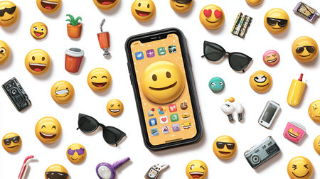 A vibrant smartphone stands against a soft background, surrounded by floating smiley emojis and heart icons, symbolizing love and digital connection in today's world.