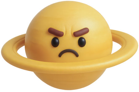 A 3D cartoon yellow planet with rings, featuring an angry and grumpy facial expression, symbolizing frustration or challenges