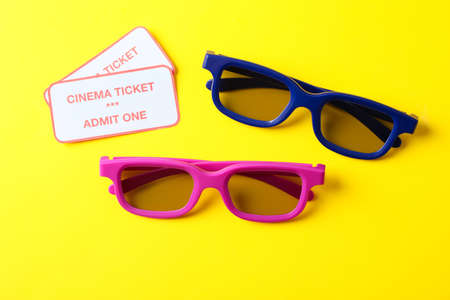 3d glasses and tickets on yellow background, space for text