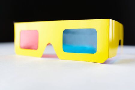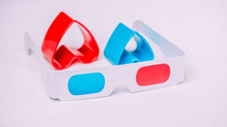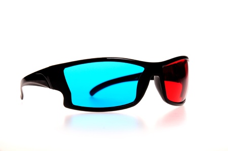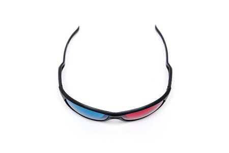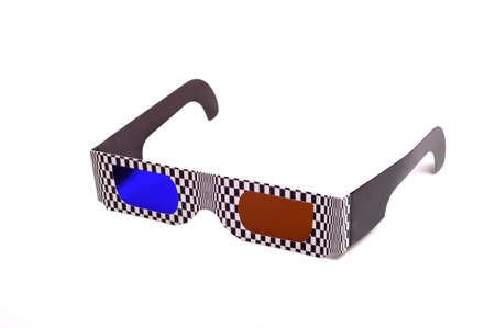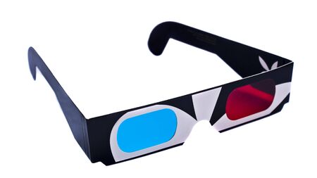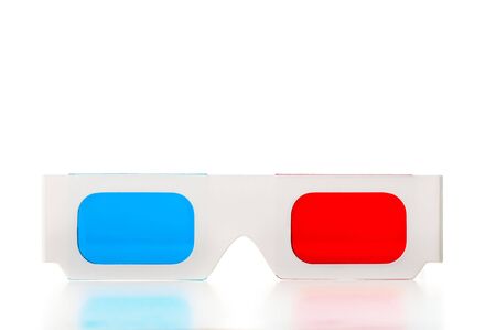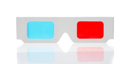 Cinema stereo glasses with blue and red eyes isolated on white