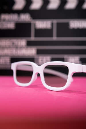 White 3d glasses on a movie clapper rose background. vertical photo.