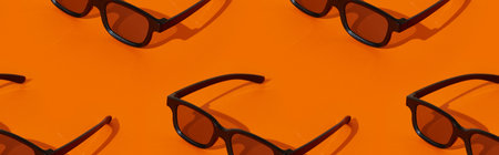 Pattern made with black plastic 3d glasses on orange background