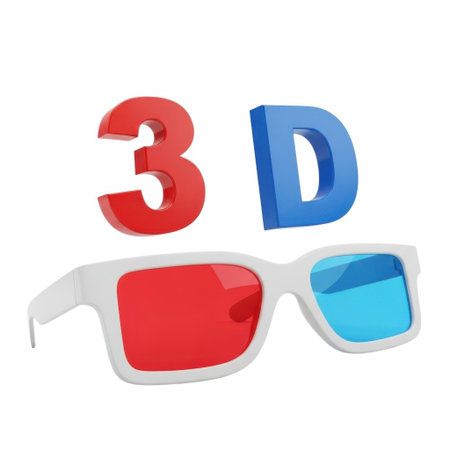 Bright, bold 3D lettering hovers above iconic red and cyan anaglyph spectacles, symbolizing stereoscopic entertainment.