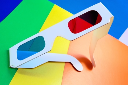 Stereo glasses for viewing anaglyph images on a colorful background.