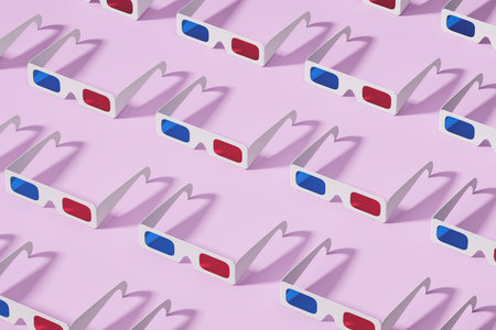 Top view of multiple 3D glasses pattern, cinema accessory. Anaglyph glasses with red and blue lens on purple background. 3D rendering
