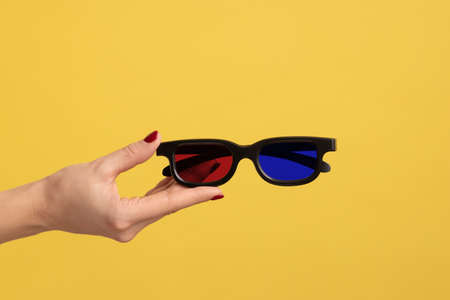 Profile side view closeup of woman hand holding and showing 3d eyeglasses for watching movie in cinema. Indoor studio shot isolated on yellow background.