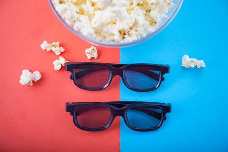 Movie time. Stereoscopic anaglyph disposable paper 3d glasses with popcorn in pink blue gradient neon light.
