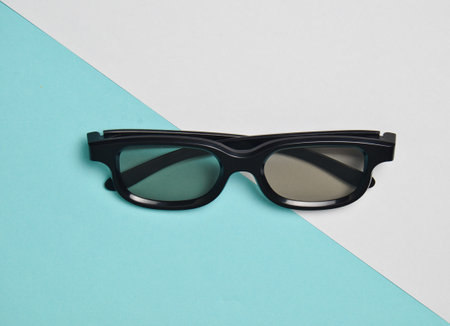 Stereo 3D glasses on a blue pastel background. Top view