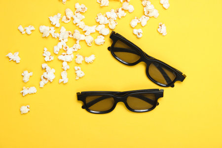 Two pairs 3D glasses, popcorn on yellow background. Top view, flat lay