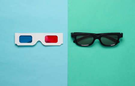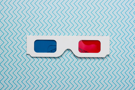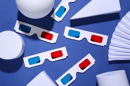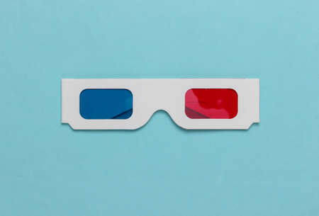 Stereoscopic anaglyph disposable paper 3d glasses on blue background. Top view