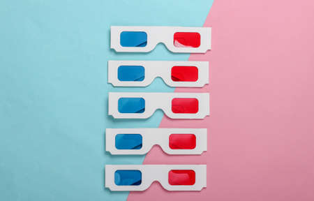 Many stereoscopic anaglyph disposable paper 3d glasses on pink blue pastel background. Top view