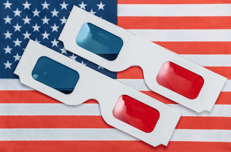 Anaglyph 3D glasses on the background of USA flag. hollywood blockbuster