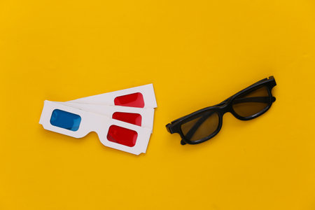 3d glasses on yellow background. entertainment. top view