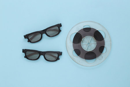 Film reel and 3D glasses on blue background. entertainment industry. Cinema. top view