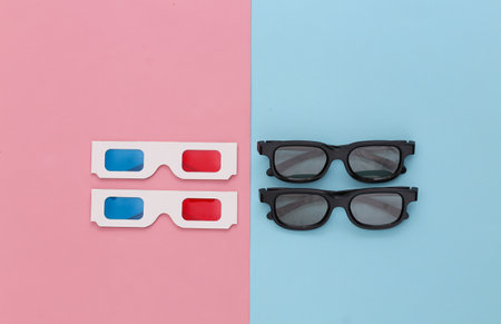Two pairs of 3d glasses on a pink blue pastel background. Top view. Minimalism