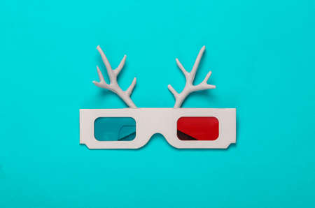 minimal layout. Deer antlers with 3d glasses on blue background. top view. concept art