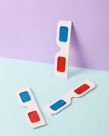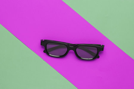 3D glasses on a green-purple background. Top view