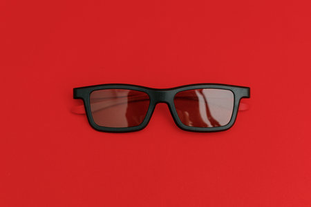 Black sunglasses lying on a red background