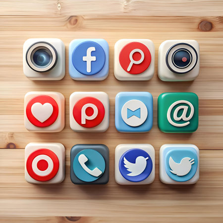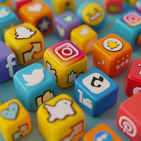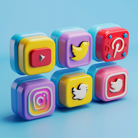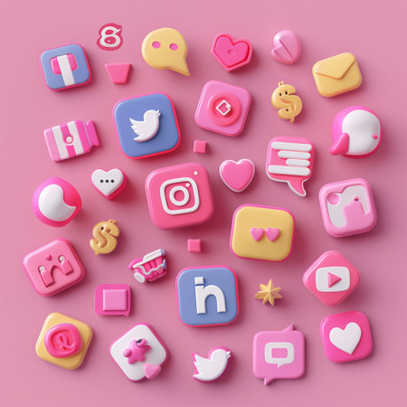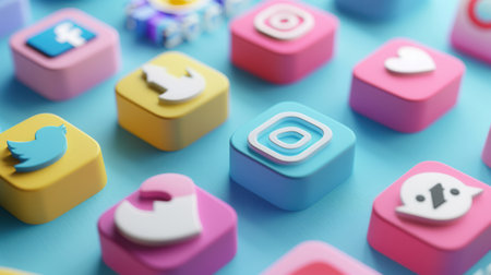 Various social media icons in bright colors laid scattered on a pastel background, symbolizing online interaction and connectivity.
