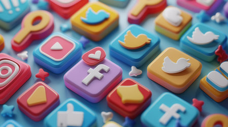 Colorful 3d rendering of social media icons on blue background.