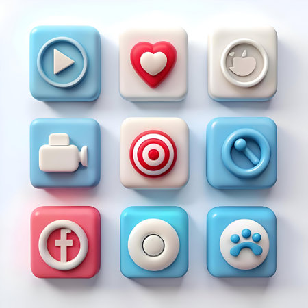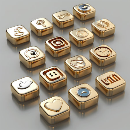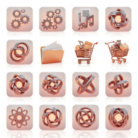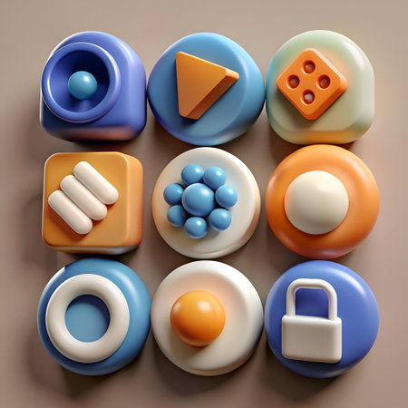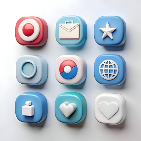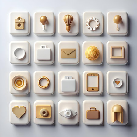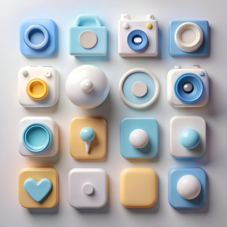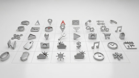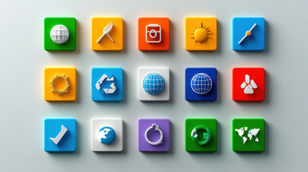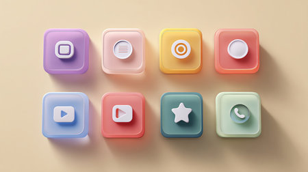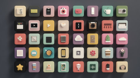 Colorful app icons arranged in a grid on a smooth surface, highlighting their unique shapes and functions, creating an eye-catching digital aesthetic.