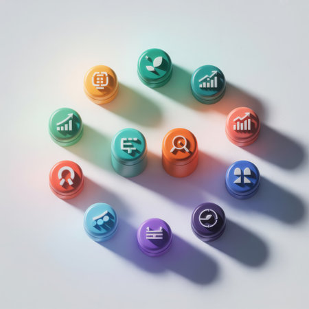 A collection of brightly colored dice, each featuring a different business-related icon, are artfully arranged on a clean surface. The icons depict growth charts, financial symbols, and abstract representations of market activity. The vibrant colors and symbolic imagery evoke concepts of strategy, investment, chance, and the dynamic nature of business and economics. This visually engaging composition suggests themes of opportunity, risk, and the multifaceted world of finance and analytics.