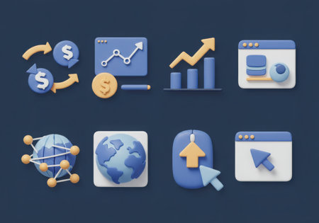 A collection of eight distinct 3D icons representing financial transactions, data analysis, global connectivity, and digital interfaces.