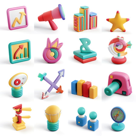 Vibrant 3D Icons Collection: Business, Technology, and Social Media Symbols.