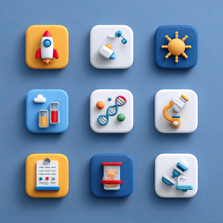 A collection of vibrantly colored 3D icons, rendered against a solid blue backdrop. The arrangement includes symbols related to science, technology, and exploration, suggesting creativity and innovation. These visual elements may be suitable for illustrating concepts in digital design, educational materials, and various commercial applications.