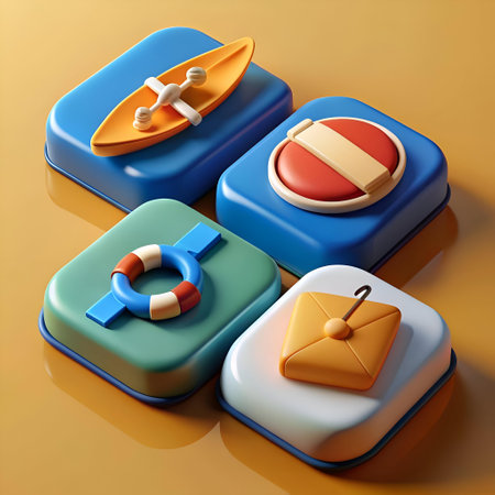 Colorful 3D icons representing vacation essentials: a lifebuoy. a canoe. a suitcase. and a stop sign. Ideal for travel. summer. and vacation themes.