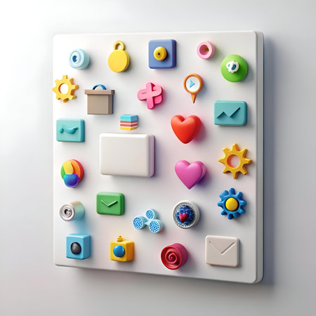 Colorful 3D icons connected by white lines. representing a network of interconnected elements. Perfect for illustrating online connectivity. social media. or data flow.