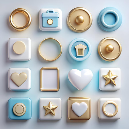 A set of 9 unique 3D icons featuring a modern. minimalist design with a blend of gold and pastel blue colors. Perfect for adding a touch of elegance and sophistication to mobile apps. websites. and social media graphics.
