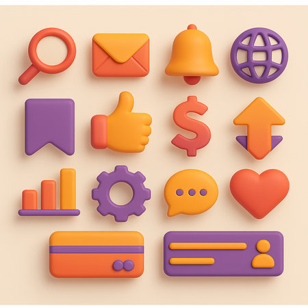 A vibrant collection of 3D cartoon icons. perfect for adding a playful touch to your designs. These icons represent common web and app functions. making them ideal for interfaces. illustrations. and branding.