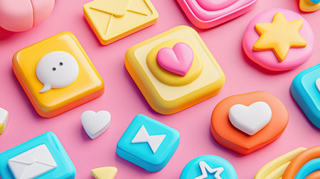 A collection of vibrant digital icons featuring hearts, stars, and messages on a playful pink background, perfect for social media and app design.