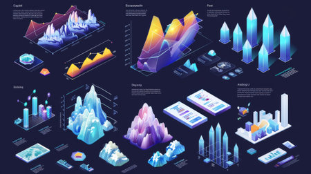 Diagrams and charts in isometric format, 3D data analysis columns, infographic modern elements, financial information statistics..