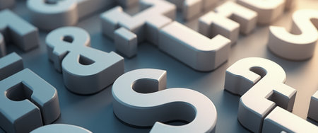 A captivating arrangement of glossy 3D letters, including ampersands and various characters, creates a visually striking scene. The interplay of light and shadow enhances the depth and texture, inviting viewers to explore the artistic representation of typography.