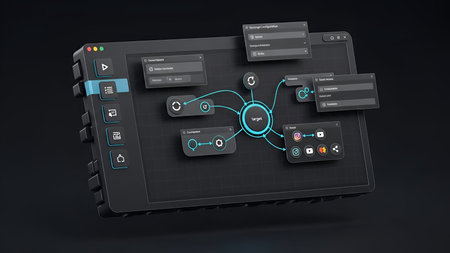 The a dark screen displaying a flowchart with blue nodes and connecting lines. The nodes are interconnected with lines, representing a network or process flow. The interface appears to be part of a software application, likely used for visualizing data or workflows. The screen is black with blue and gray and the overall style is digital and abstract.