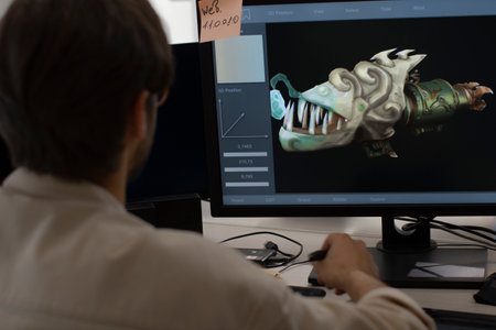 A graphic designer uses advanced technology to create intricate 3D models in a contemporary office.