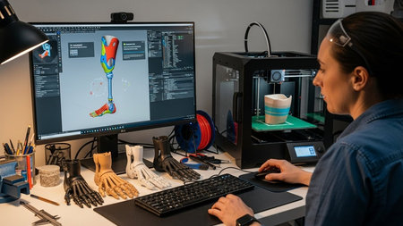 A person is operating a 3D printer, creating a prosthetic limb. The computer screen displays a detailed 3D model of the limb, showcasing the advanced technology used in the process.