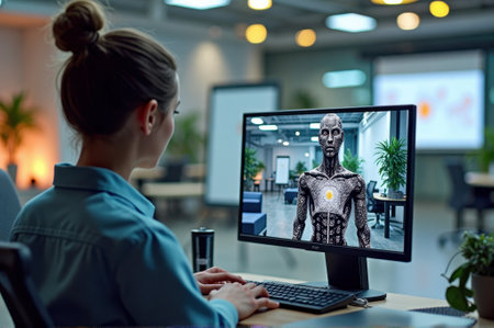 Female programmer interacting with ai robot on computer screen in modern office setting. That the image is generated using AI.