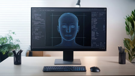 Top view of a computer screen displaying AI-based image analysis algorithms for facial recognition, surrounded by a minimalistic desk and plenty of space for text.