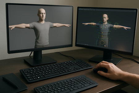 A detailed view of a digital artist working on a computer setup, featuring dual monitors displaying a 3D human character. One screen showcases the fully rendered character model, while the other reveals the intricate rigging and skeletal controls within a 3D animation software interface. The scene includes a person's hand on a mouse, along with keyboards and a graphic tablet on a wooden desk, emphasizing the advanced process of virtual character creation and animation.