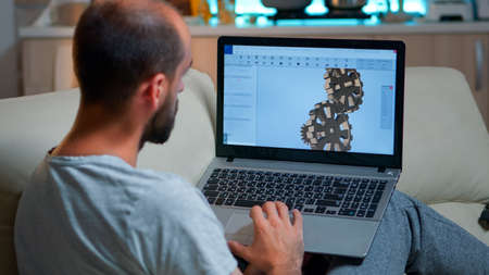 Industrial engineer manufacturing gears product, wokring on technical product construction with creative cad software. Prototyping machinery production and engine model graphics at home.