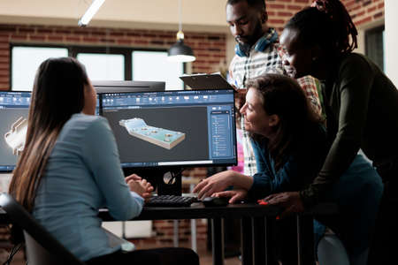 Creative agency employees brainstorming together to find solutions in order to optimise 3D scene. Digital artists working together using advanced specialized software to improve mesh geometry.