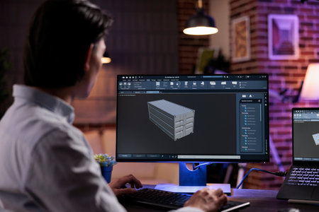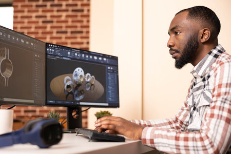 African american male engineer seated at home desk, developing digital prototypes using computer aided design tools. Creative developer focused on construction innovation and 3D modeling workflow.
