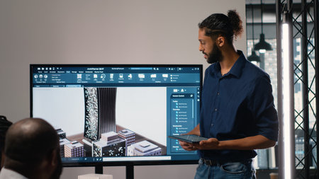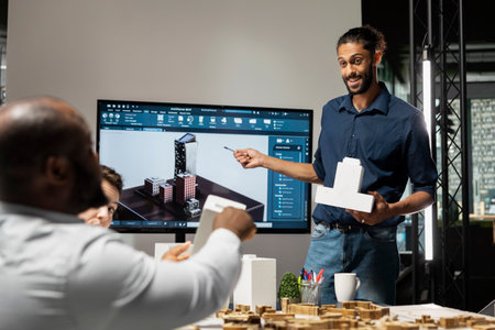 Real estate expert leading city planning session with 3D models for details and zoning regulations, focusing on site development and infrastructure growth for housing and urban development.