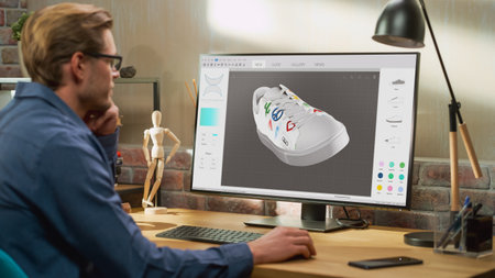 Young Male Footwear Designer Works on 3d Model of Shoe and Change Colours on It While Working on Desktop Computer in Creative Space. Shoe