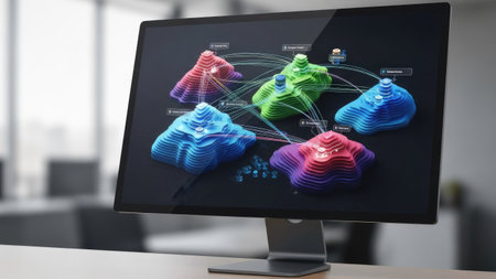 A computer screen displays an abstract data visualization featuring colorful, interconnected geometric shapes. The image exhibits a modern style with soft lighting and a blurred background. This visual could be used for illustrating data analysis, business presentations, or technology concepts.