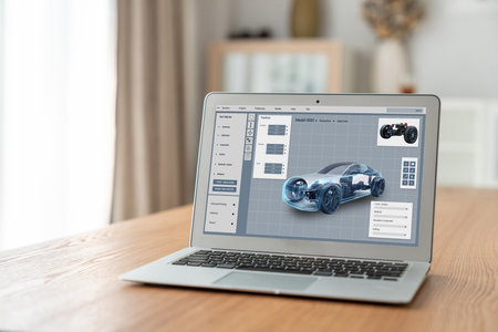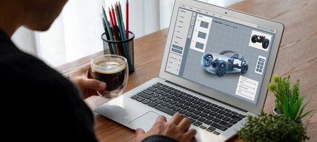 Electric car design software on computer screen showing simulation blueprint snugly by digital calculating application for manufacturing preparation