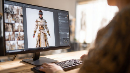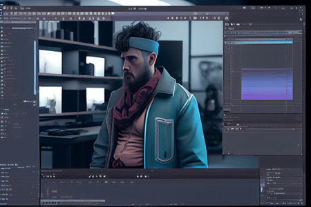 The game designer writes a project and creates a 3d character to play in the program on the computer online in the office. Generative AI